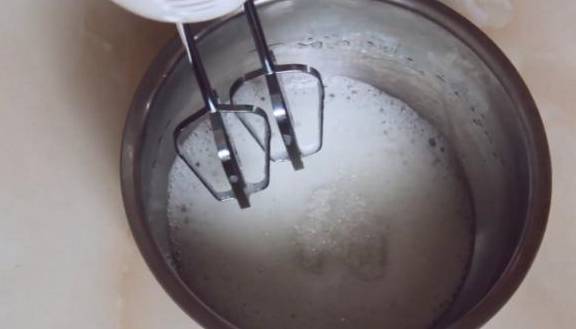 步骤4、蛋白液里滴入2滴白醋(去除蛋腥味),用搅拌器把蛋白打发成鱼眼泡时加入10克白糖。(鱼眼泡的意思是蛋白里面的泡泡的大小像鱼眼睛一样,这个状态的蛋白不稳定,鱼眼泡容易破碎)