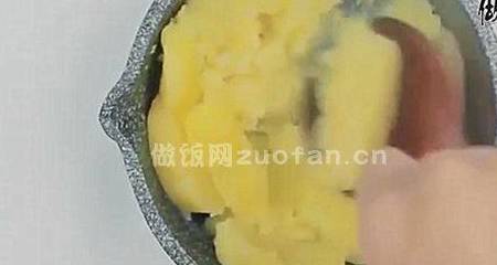 1土豆用清水洗净后去皮,切成1厘米左右的片状。放入锅内大火蒸10分钟左右,蒸熟后取出压成泥。
