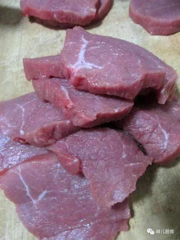 1、首先把牛肉切成2厘米的厚片,刀工很重要,不要切得一边厚一边薄。