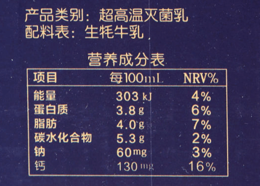 从营养成分表上我们可以看到,每100mL牦牛奶的 蛋白质含量高达3.8g,钙含量达130mg。