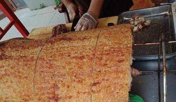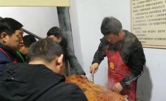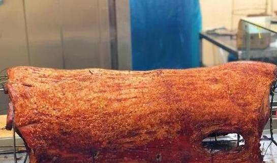 就是当时非常火爆的脆皮烤猪,他的做法跟我们平时吃的烤猪还不太一样,在制作脆皮烤猪的时候,需要把猪头和猪尾巴去掉,还有他的内脏和4条腿都要去掉,只留下猪身子外面的一层肉,然后把他们放到一个特制的烤架上,需要烤好几个小时才能把它烤熟,烤过以后到脆皮烤猪,他的外表特别的脆,切的时候都能听到嘎嘣的响声。