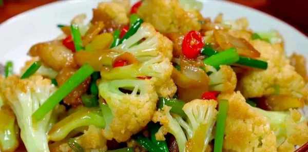 2、锅中下入肥肉,煸炒出肥油,炒至肥肉微微焦黄,再下入蒜片炒出香味,再加生抽,蚝油炒出酱香味。然后再下入花菜,一定要开大火炒干水分,炒至花菜断生。再加点盐,鸡精,再把青红椒给加进来炒至断生。最后加入韭菜花,翻炒几下就可以出锅啦。