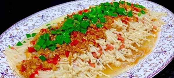 4、锅里水烧开,放入蒸锅盖盖,大火蒸十分钟,蒸制金针菇熟透后,取出淋上蒸鱼豉油,撒上一层葱花,最后浇上热油。就做好了。
