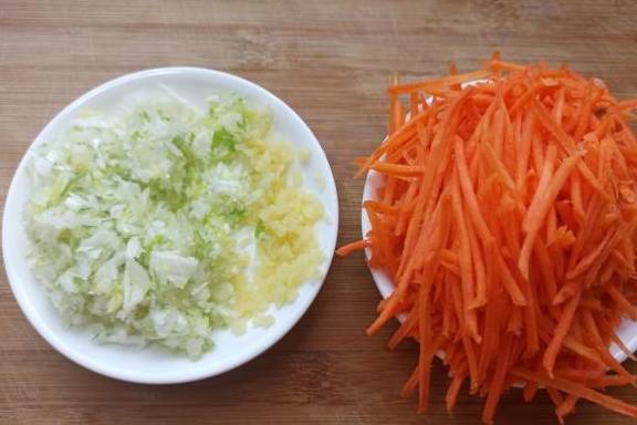 4、把胡萝卜擦成细丝,葱姜剁得碎一些,尽量越碎越好。