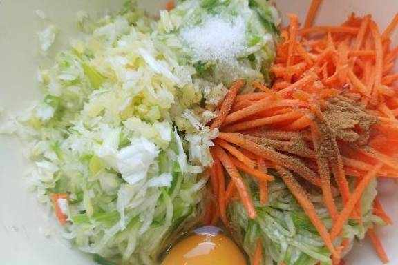 5、把胡萝卜丝和葱姜末倒入,打入1个鸡蛋,加入适量十三香,盐可以放或者不放,因为之前已经腌过了。