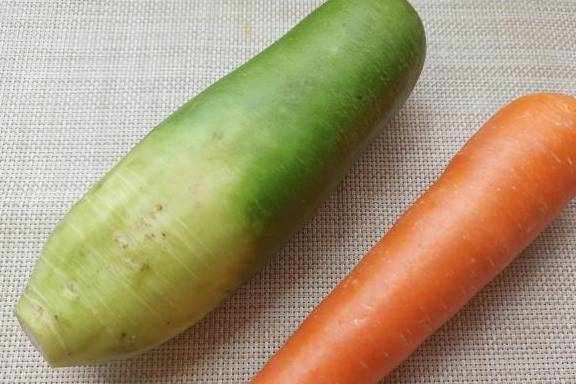 1、准备青萝卜和胡萝卜各一个,价格实惠,营养丰富,冬季正是吃萝卜的季节。