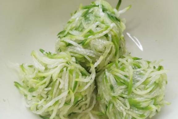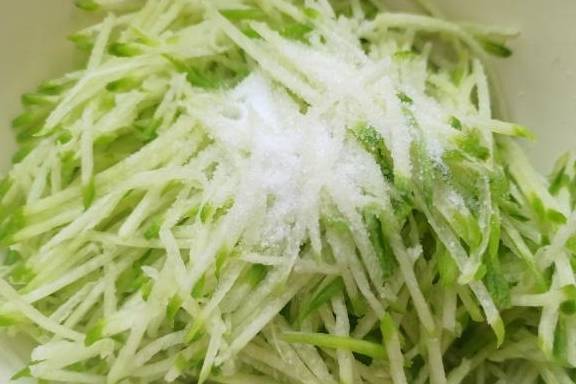 2、青萝卜洗净,外皮个人喜好,可削可不削,用擦丝器处理成细丝,撒一勺盐,腌制15分钟。