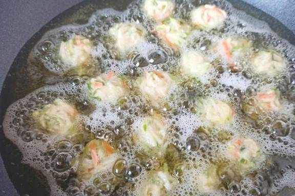 8、戴好一次性手套,用手搓成丸子,等待油温6成热,下入油锅,全程开小火,急火容易糊掉,外面焦了里面还不熟。