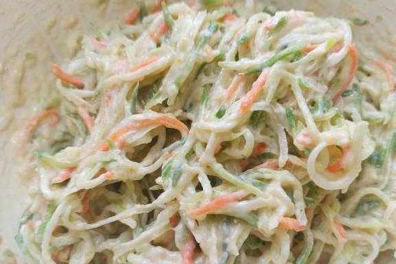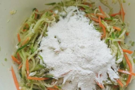 7、加入面粉的量,不需要太多,可以打成团就行,面粉多了口感发硬,萝卜丝裹满面糊即可。