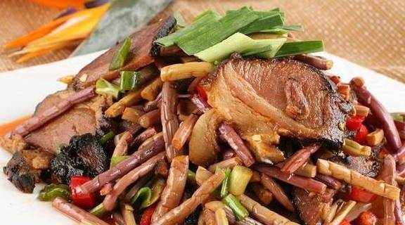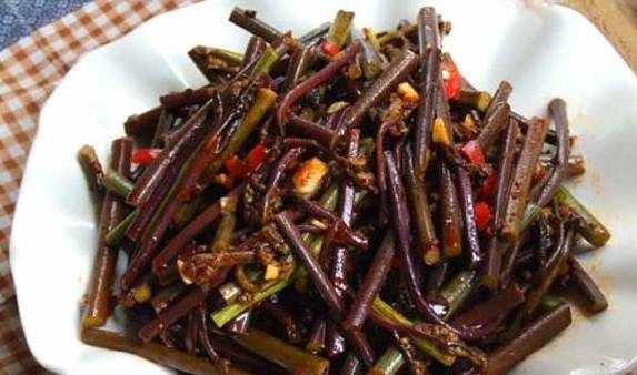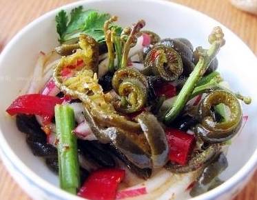 【蕨菜腊肉】蕨菜放入锅中用开水焯一下,不要焯太久,3分钟左右就够了焯好的蕨菜过凉水,然后用手掐去头尾,分成10厘米左右的小段,每一段再一分为四洗干净的腊肉放入锅中煮十分钟,稍放凉后切成薄片,干辣椒切小段、蒜切碎锅中放适量植物油,放入腊肉煸炒出油,再放入蕨菜一同翻炒放入干辣椒和蒜碎,放少许盐和酱油调味,翻炒均匀即可。