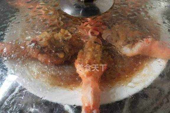 8.调汁用勺浇在虾背处粉丝上。