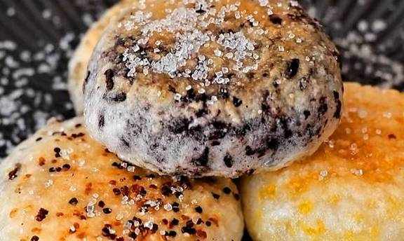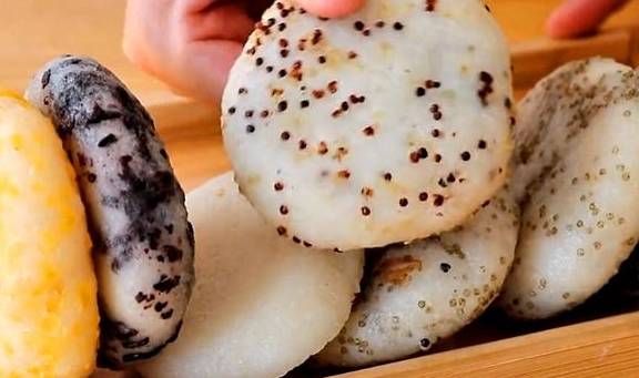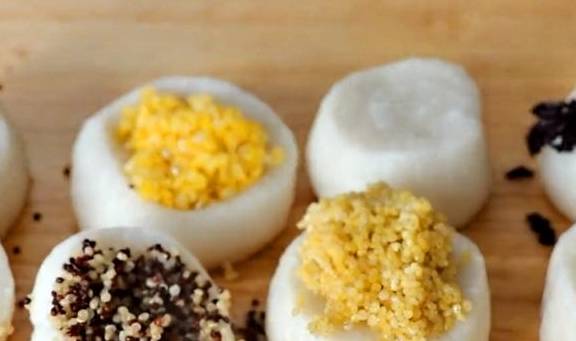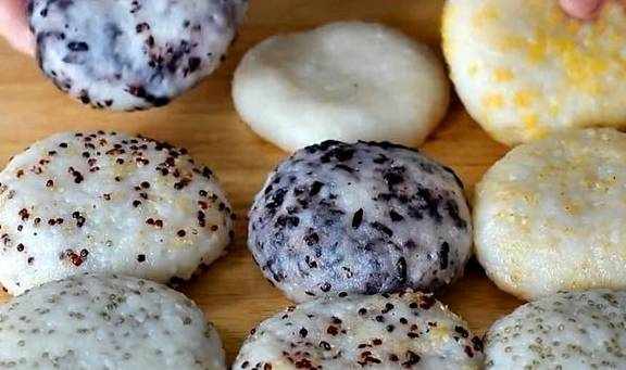 把早就蒸好的五谷杂粮放到每个糯米团上,如果想吃原味的用手轻轻按压成饼就可以了,其他五谷的就需要用手不停的揉捏糯米团,让五谷充分和糯米团融合,最后压成饼,所有的口味都揉搓好之后,可以放到冰箱里冷冻,用水泡都不会坏,我一般都是油炸或者煎着吃,你想要水煮或者蒸着吃也可以,我喜欢吃表皮酥脆里面暄软的口感,大概煎上五到六分钟,煎到两面金黄,中间微微鼓起就可以了,喜欢吃甜的朋友可以撒上一点白糖,喜欢吃咸的朋友可以放辣椒酱,撕开里面非常软糯,表皮特别酥脆特别香。
