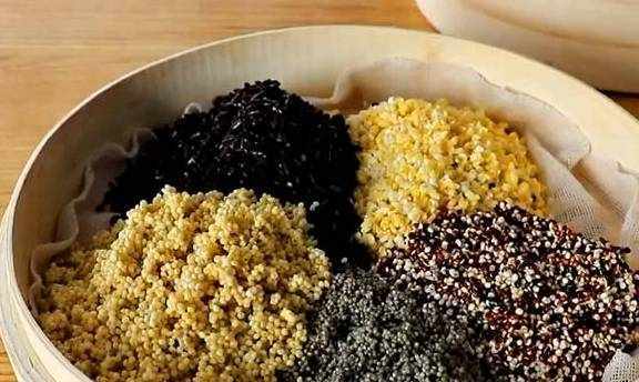 提前一天把糯米泡好,准备五谷杂粮,包括黑米、小米、玉米碎、紫米都提前泡发好,第二天早上就可以直接清洗干净,然后将糯米和五谷沥干水分,把糯米和五谷分成两个笼屉蒸熟,最好选择木笼屉,这样蒸出来的米饭特别香,水开后放进去蒸二十五分钟,蒸好后稍微放冷,案板上抹上一层熟油,将蒸好的糯米放上去。