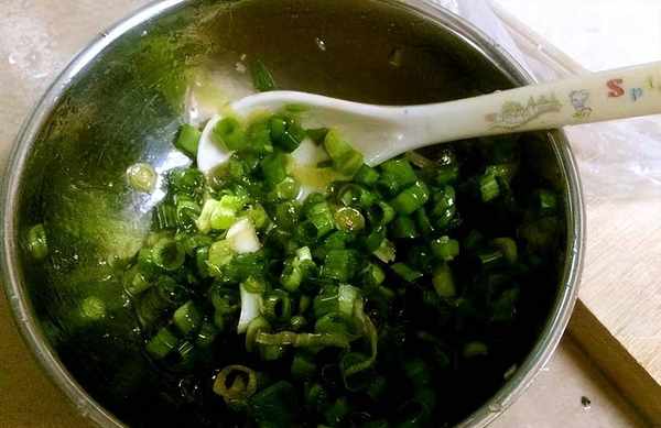 3.市场上买回来的新鲜小葱去掉葱根和干叶,清洗干净,沥干表面水分,将葱白切掉不要,我们只留绿色的葱叶部分,葱白可以留着炒菜用。葱叶切成细碎的小段,加入食用油搅拌均匀备用(葱花里可以放一些小苏打,这样可以保持葱花的颜色更加鲜艳,也更加好吃);