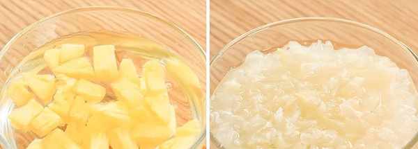 银耳含有非常丰富的胶原蛋白以及人体所需的微量元素和氨基酸。我们可以做一份菠萝银耳汤,胶原满满的银耳配上维C满满的菠萝丁,柔软滑顺,酸甜可口,又营养又美味,是十分健康的消暑餐后甜品呢~下面就看做法吧。