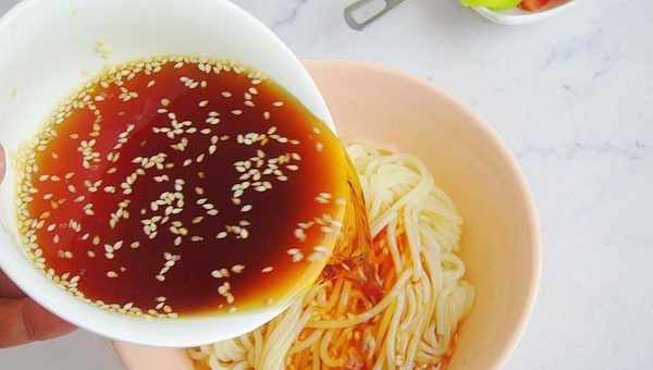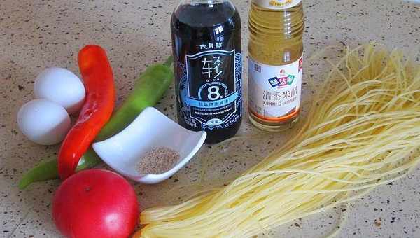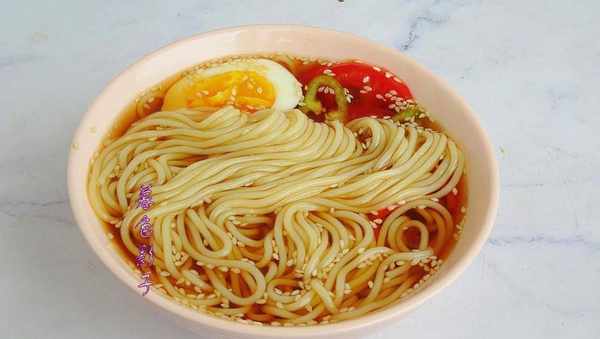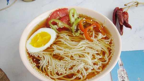 食材;冷面1把,三月鲜8克轻盐原汁酱油1勺,味达美清香米醋1勺,白糖3勺,白芝麻适量,鸡蛋适量,西红柿适量,辣椒适量。
