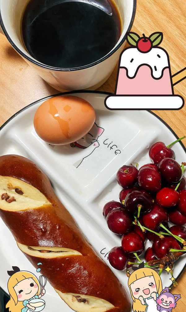 最爱的樱桃、煮鸡蛋一个、红豆碱水包,一杯黑咖啡。