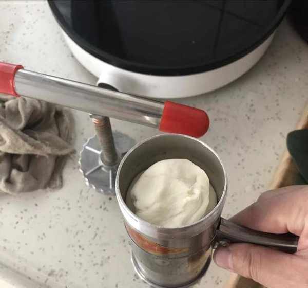 将和好的面放入桶内,然后用另外一半饸烙机将面压下。
