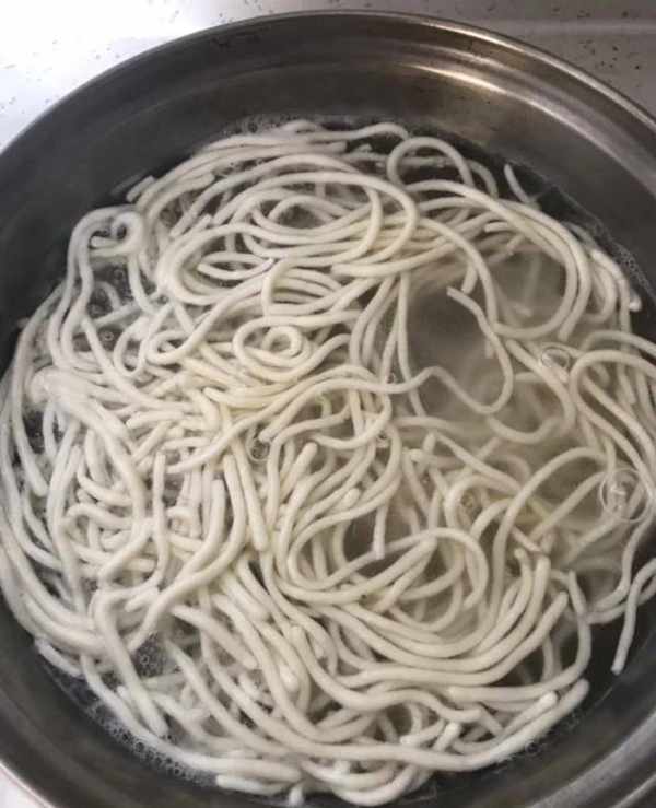 面条就从饸烙机的底部小孔中被挤出,粗细均匀,表面光滑。