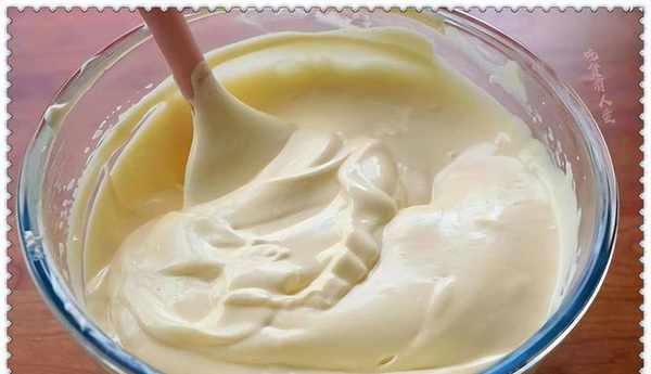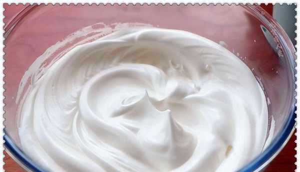 (13)淡奶油中加入适量的白糖和柠檬汁打发,打发至六成左右就可以了,也就是淡奶油变得开始浓稠就可以了。