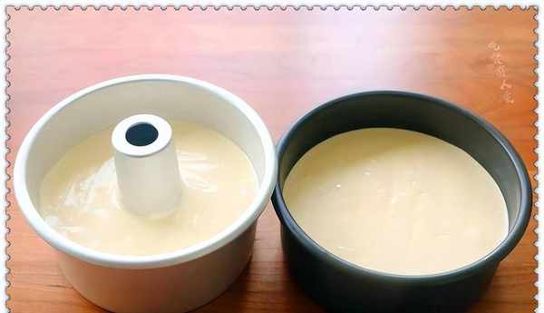(7)倒入两个模具中,简单晃一晃,震一震,将气泡震出来,此时预热烤箱,上下火调到135度,先烤35分钟,然后再转到155度,再烤18分钟左右,此时蛋糕的体积会变大,可能会涨到最高点,然后回落,5分钟之后就能够出炉了,震一震气泡,拿出来凉一下备用。