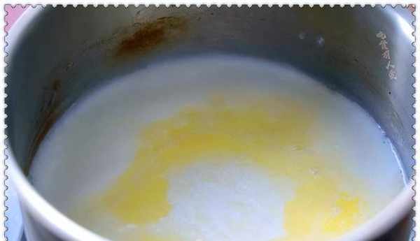 (9)锅中加入一些牛奶、黄油、盐,小火慢煮,直到锅的边缘出现很多的气泡就可以了。