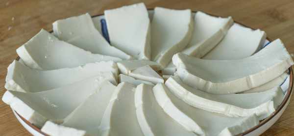 1、豆腐一块儿,先切成厚片,接着摆入盘中。