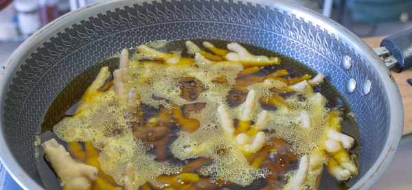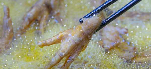 炸鸡爪的时候也不建议盖锅盖,盖上会焖出水蒸气然后滴入锅里,这样油更容易溅出来。炸到鸡爪变硬,颜色看起来也变成了黄色就可以了。
