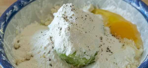 9、接着往里面再加一大勺面粉,大约是50克,继续翻拌均匀,直到抓起来是粘稠的面糊就可以了。