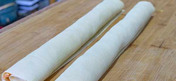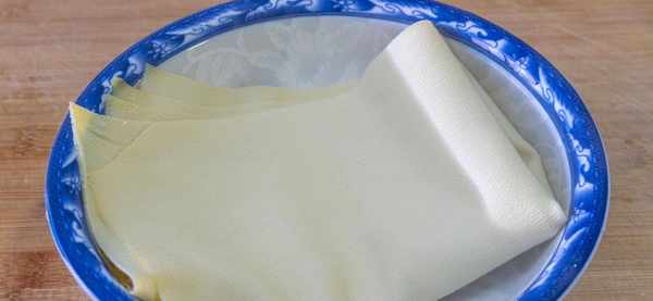 10、下面我们准备两张豆腐皮,先用开水烫一下,这样可以去除豆腥味,泡5分钟后捞出控一控水分。