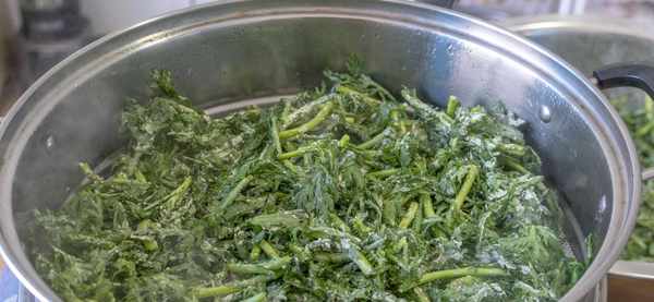 5、接着起锅烧水,放上蒸笼,铺上垫子,盖上盖子后大火烧开,水开后把茼蒿直接放进来蒸。