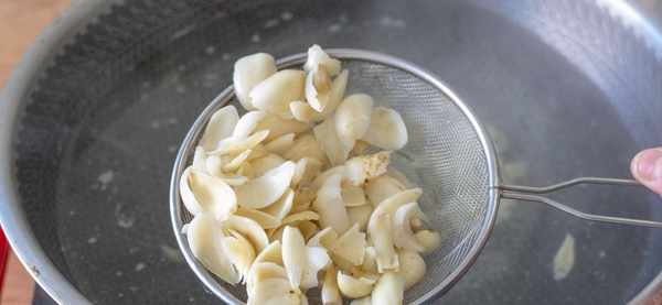 2、起锅烧水,加一勺盐和一勺油,大火煮开后倒入百合焯水1分钟,可以祛除百合的苦涩味,捞出来后控干水分先放一旁。
