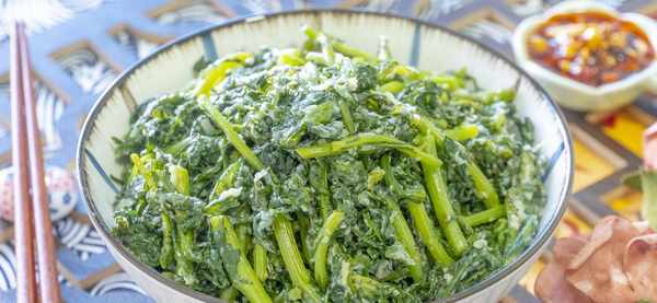 食材:茼蒿、面粉、花生油、盐、蒜末、生抽、白糖、香醋、香油、辣椒酱