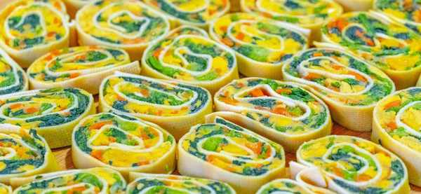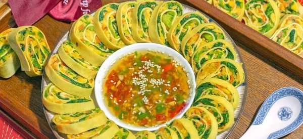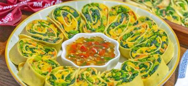 一层一层的,颜色看起来也特别的好看,全部切好后就可以装盘了。中间放上我们调好的蘸料就可以上桌了,这个菠菜鸡蛋卷即好吃又营养,一口下去都是满满的蔬菜和豆皮。低油低卡非常的健康。