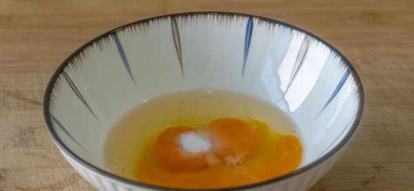 6、接着碗里打入4个鸡蛋,加一勺盐后搅散。