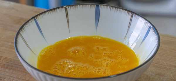 3、碗里打入2个鸡蛋,加一勺盐后搅散,接着倒入适量的温水,再加少许的百合一起搅拌下。