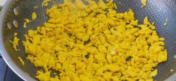 7、起锅热油,倒入蛋液后用筷子炒散,炒成鸡蛋碎后盛出来。