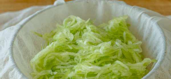3、10分钟后冬瓜出了很多水,找一块儿纱布,把冬瓜丝放进来,包好后用力挤干里面的水分。