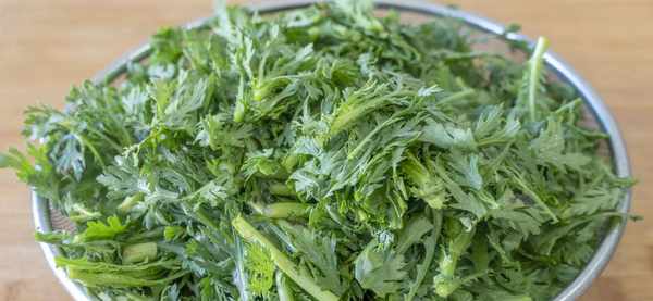 1、先准备一把茼蒿,加水清洗干净,然后切成小段儿,装起来控一控水。
