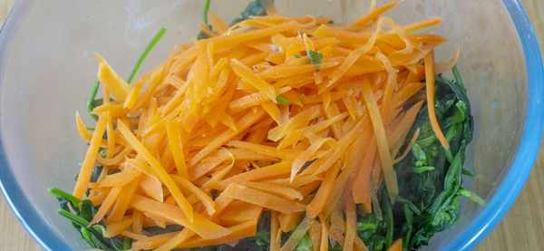 5、再把胡萝卜也倒进来焯水1分钟,捞出来后和菠菜装到一起。