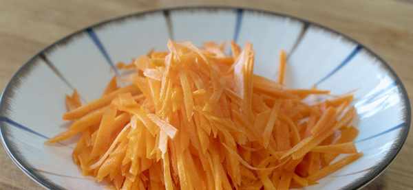 2、再准备一根胡萝卜,去皮后先切片,再切丝。