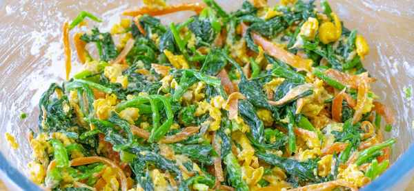 食材:1斤菠菜、1根胡萝卜、4个鸡蛋、50克面粉、2张豆腐皮、盐、胡椒粉、鸡精、生抽、蚝油、葱花、蒜末、小米辣、白芝麻、热油、香醋、香油