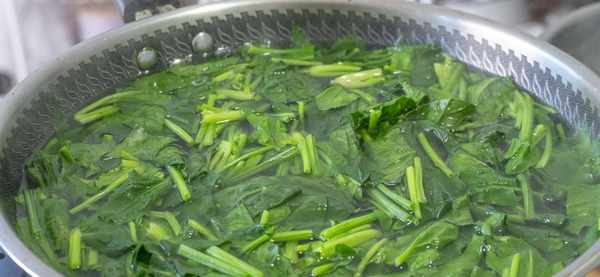 3、接着起锅烧水,水开后加1勺盐、两滴食用油,接着把菠菜倒进去先焯下水。