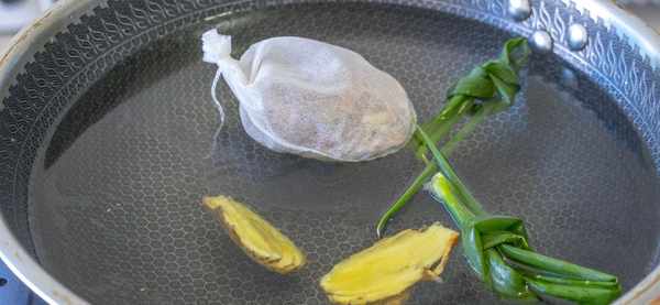4、接着起锅烧水,加2块儿生姜、2个葱结、1个卤料包。