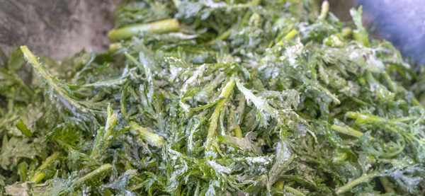 3、先均匀的撒在茼蒿上面,然后再轻轻的抄拌一下,让蔬菜上面都能裹上一层面粉。