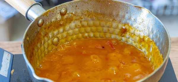 11、起锅热油,倒入西红柿翻炒,加一勺盐更容易出汁儿,继续炒,炒到西红柿出沙后倒入调好的淀粉水,开大火煮,煮到汤汁变浓稠后关火。