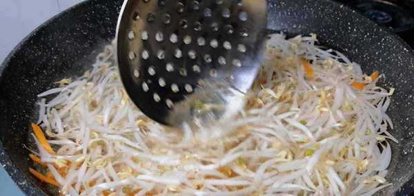 3、锅中烧水,将浸泡好的绿豆芽放入开水中烫30秒捞出过凉水,沥干水分;同样胡萝卜烫30秒,捞出过凉水,沥干水分,备用。