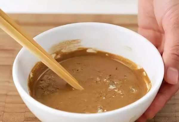 4、准备一个碗,倒入适量麻酱,倒入适量水,顺时针方向不断搅拌,搅拌上劲,再放入适量水,调稀,放入蒜泥、鸡精、食用盐、醋、白糖,搅拌均匀。