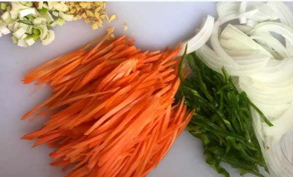 2、胡萝卜、洋葱、青椒切丝,姜切成姜末。
