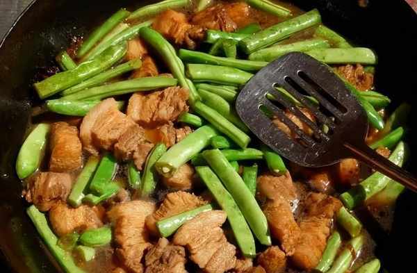 3、锅中烧油,油热后先放入蒜末爆炒出香味,然后放入腌制好的五花肉片,炒至微微焦黄出油即可;放入一勺老抽、一勺生抽调味,炒至8时尚,倒入豆角,炒至颜色变得翠绿,放入适量开水,量没过豆角即可,盖上盖子,开大火焖3分钟。